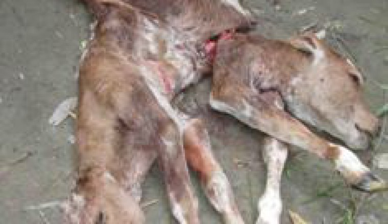 শাহজাদপুর প্রতিনিধিঃ আজ রোববার বিকেলে শাহজাদপুর উপজেলার নরিনা ইউনিয়নের নাবাবিলা গ্রামের শওকত মন্ডলের একটি শংকর জাতের গাভী দুই মাথা ও সাত পা বিশিষ্ট একটি অদ্ভুত আকৃতির বাছুরের জন্ম দিয়েছে। এ ঘটনা এলাকায় ছড়িয়ে পড়লে বাছুরটি এক নজর দেখার জন্য সেখানে শত শত নারী পুরুষ ও শিশু ভিড় জমায়। গাভীর মালিক শওকত মন্ডল জানায়, এদিন দুপুরে তার গাভীটির প্রসব বেদনা শুরু হলে নিজেরা ব্যর্থ হয়ে স্থানীয় পশু চিকিৎসক আরশেদ আলম তোতা ও ছাদেক আলী দুই ঘন্টা চেষ্টার পর অদ্ভুত আকৃতির দুই মাথা ও সাত পা বিশিষ্ট মৃত বাছুরটি প্রসব করান। চিকিৎসকদ্বয় জানান, গাভীটির জরায়ু মুখের চেয়ে বাছুরটির আকৃতি বড় হওয়ায় এবং বাছুরটি ভুমিষ্ঠ্য হওয়ার আগেই মারা যাওয়ায় সহজে বাছুরটি ভুমিষ্ঠ্য হচ্ছিলনা । ফলে নিরুপায় হয়ে এবং গাভীটিকে বাচানোর স্বার্থে বাছুরটির একটি অংশ কেটে টুকরো করে বের করতে হয়েছে। এ ব্যাপারে শাহজাদপুর উপজেলা প্রাণিসম্পদ কর্মকর্তা ডা. আব্দুল হাই জানান, চিকিৎসকরা প্রাণপন চেষ্টা করেও বাছুরটিকে বাচাতে না পারলেও গাভীটিকে জীবিত ও সুস্থ্য রাখতে সক্ষম হয়েছে। গাভীটি এখন শংকামুক্ত রয়েছে বলেও তিনি দাবী করেন।