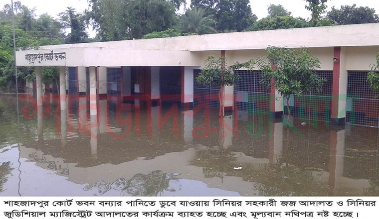 [slideshow_deploy id='6321'] নিজস্ব প্রতিনিধিঃ শাহজাদপুর আদালত ভবন বন্যার পানিতে ডুবে যাওয়ায় বিচার কার্য চরম ভাবে ব্যহত হচ্ছে।বার কাউন্সিলের সভাপতি এ্যাডভোকেট আনোয়ার হোসেন জানান, এজলাসের মধ্যে বন্যার পানি ঢুকে পড়ায় বিচার কার্য ব্যহতর পাশাপাশি বিচারাধিন বহু মামলার নথি পত্র পানিতে ভিজে নষ্ট হয়ে যাচ্ছে। এতে বিচার প্রার্থীদের সমস্যা সৃষ্টি হচ্ছে। তিনি এ আদালতটি দ্রুত অন্য ভবনে স্থানান্তরের দাবী জানান। এ ছাড়া বিশ^ কবি রবীন্দ্রনাথ ঠাকুরের কাছারিবাড়ি ও ঐতিহ্যবাহী শাহ মখদুমিয়া জামে মসজিদ বন্যার পানিতে ডুবে গেছে। ফলে দর্শনার্থী ও মুসল্লিদের নামাজ আদায়ে দূর্বোগ বেড়েছে। শাহজাদপুর উপজেলা দূর্যোগ ব্যবস্থাপনা অধিদপাতর সূত্রে জানা গেছে, উপজেলার ১৩টি ইউনিয়নে পানি বন্দি হয়ে পড়েছে ১ লাখ ৬৬ হাজার মানুষ। ৩৭ হাজার কাঁচা ঘরবাড়ি বন্যার পানিতে ডুবে যাওয়ায় জনদূর্ভোগ চরমে পৌছেছে। পানি বন্দি মানুষ ত্রাণের জন্য হাহাকার করছে। পোরজনা-জামিরতা পাকা সড়ক ও চরকৈজুরী-চরগুধীবাড়ী সড়ক বন্যার পানিতে ডুবে গিয়ে যোগাযোগ বিচ্ছিন্ন হয়ে পড়েছে। কৈজুরী বাজার,জামিরতা বাজার,পোরজনা বাজার ও গুপিয়াখালী বাজার বন্যার পানিতে ডুবে গেছে। এছাড়া রাউতারা স্লুইচ গেট সংলগ্ন রিং বাধ বন্যার পানিতে ডুবে শাহজাদপুর সহ চলন বিল অঞ্চলের বিস্তৃর্ণ এলাকা বন্যা কবলিত হয়ে পড়েছে। অপরদিকে শাহজাদপুর উপজেলার কৈজুরী মাদ্রাসা, প্রাথমিক বিদ্যালয়, কৈজুরী ইউনিয়ন পরিষদ চত্ত্বর, কৈজুরী ভূমি অফিস ও উপস্বাস্থ্য কেন্দ্র চত্ত্বর বন্যার পানিতে ডুবে গেছে। ফলে এলাকাবাসীকে বন্যায় চরম দূর্ভোগ পোহাতে হচ্ছে। কৈজুরী প্রাথমিক বিদ্যালয় ও জামিরতা কলেজ, কৈজুরী মাদ্রাসা বন্যার পানিতে ডুবে যাওয়ায় বন্ধ ঘোষনা করা হয়েছে। অপরদিকে শাহজাদপুরে গো-খাদ্যের তীব্র সংকট সৃষ্টি হওয়ায় প্যাকেট জাত খাদ্যের দাম বস্তা প্রতি ২০০ থেকে ২৫০ টাকা বৃদ্ধি পেয়েছে। কৈজুরী ইউনিয়ন পরিষদের চেয়ারম্যান সাইফুল ইসলাম তার এলাকার বন্যা দূর্গত মানুষের জন্য পর্যাপ্ত ত্রাণ,আশ্রয়কেন্দ্র ও নোঙর খানা খুলে দেওয়ার জোর দাবী জানিয়েছেন। সরকারী বাবে এ পর্যন্ত ৬৫ মেঃ টন চাল ও নগদ ৮০ হাজার টাকা বরাদ্দ পাওয়া গেছে।