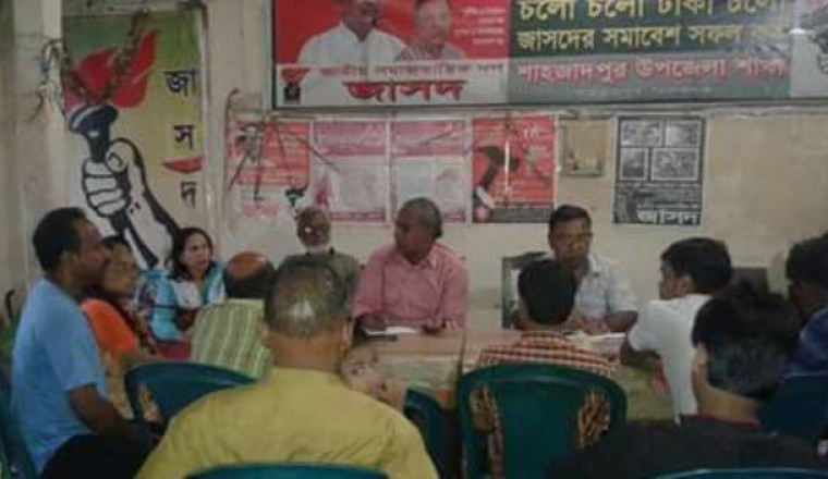 শামছুর রহমান শিশির, শাহজাদপুর থেকে : আজ শুক্রবার সকালে শাহজাদপুর উপজেলা জাসদ দলীয় কার্যালয়ে উপজেলা জাসদের উদ্যোগে জাসদের ৪৫তম প্রতিষ্ঠা বার্ষিকী ও রুশ বিপ্লবের শতবর্ষ উদযাপন, উপজেলা জাসদের সম্মেলন এবং সদস্য নবায়ন ও নতুন সদস্য সংগ্রহ বিষয়ে জরুরী সভা অনুষ্ঠিত হয়েছে। এদিন সকাল ১১ টায় দলীয় কার্যালয়ে জাসদ শাহজাদপুর উপজেলা কমিটির এক জরুরী সভা অনুষ্ঠিত হয়েছে। শাহজাদপুর উপজেলা জাসদ সভাপতি ও সাপ্তাহিক জনতার মশাল পত্রিকার সম্পাদক শফিকুজ্জামান শফির সভাপতিত্বে ও উপজেলা জাসদের সাধারণ সম্পাদক আবু হাসান খান মনি'র সঞ্চালনায় অনুষ্ঠিত উপজেলা জাসদের ওই জরুরী সভায় অন্যান্যের মধ্যে বক্তব্য রাখেন, সিরাজগঞ্জ জেলা জাসদের সাংগঠনিক সম্পাদক, সাংবাদিক হাসানুজ্জামান তুহিন, জেলা কমিটির মহিলা বিষয়ক সম্পাদক ও উপজেলা কমিটির সহ-সভাপতি প্রভাষক সৈয়দা নাছিমা জামান,উপজেলা কমিটির মহিলা বিষয়ক সম্পাদক নাছিমা খালেক সেলিনা, রীতা চক্রবর্তী, আব্দুস ছাত্তার,আকবর হোসেন, সাইদুল ইসলাম, মেহেদী হাসান লিটন, সৈয়দ আদিত্য জামান প্রমুখ। অনুষ্ঠিত ওই জরুরী সভায় সর্বসম্মতিক্রমে প্রস্তাবিত ও গৃহিত সিদ্ধান্তগুলি :- ১. আগামী ৩১ অক্টোবর ২০১৭ খ্রি. মঙ্গলবার বিকেলে দলের ৪৫ তম প্রতিষ্ঠা বার্ষিকী ও রুশ বিপ্লবের শত বর্ষ পালন উপলক্ষে জনসভা ও বর্ণাঢ্য লাল পতাকা মিছিল অনুষ্ঠানের প্রস্তাব গৃহীত, ২.আগামী ডিসেম্বরের মধ্যে উপজেলা ও পৌর জাসদের সম্মেলন অনুষ্ঠানের প্রস্তাব গৃহীত, তার আগে ইউনিয়ন ও পৌর ওয়ার্ড কমিটি পুনর্গঠন করারও প্রস্তাব নেয়া হয়। সম্মেলনে প্রধান অতিথি হিসাবে জাসদ সভাপতি, মাননীয় তথ্যমন্ত্রী জনাব হাসানুল হক ইনু এমপি অথবা কেন্দ্রীয় সাধারণ সম্পাদক জনাব শিরীন আখতার এমপিকে আমন্ত্রণ জানানোর জন্য প্রস্তাব গৃহীত, ৩.সভায় একাদশ জাতীয় সংসদ নির্বাচন বিষয়ে ব্যাপক আলোচনা, আলোচনান্তে আগামী নির্বাচনে দলের পক্ষ থেকে সংসদীয় এলাকা ৬৭. সিরাজগঞ্জ -৬ (শাহজাদপুর)আসনে শাহজাদপুর উপজেলা জাসদ সভাপতি, সংগ্রামী জননেতা জনাব শফিকুজ্জামান শফিকে কেন্দ্রীয় মনোনয়ন সাপেক্ষে দলীয় প্রার্থী হিসাবে প্রতিদ্বন্দ্বিতায় অংশ নেয়ার প্রস্তাব সর্বসম্মতিক্রমে গৃহীত হয়। এছাড়া, ৪.খুব শিগগিরই একটি তারিখ নির্ধারণ করে আনুষ্ঠানিকভাবে দলের প্রাথমিক সদস্যপদ নবায়ন ও নতুন সদস্য সংগ্রহ শুরু করার প্রস্তাব গৃহীত হয়। এ বিষয়ে প্রয়োজনীয় ব্যাবস্থা গ্রহনের জন্য সভা সভাপতি এবং সাধারণ সম্পাদক মহোদ্বয়কে অনুরোধ করা, ৫.সভায় আগামী ২৮ অক্টোবর উপজেলা জাসদের প্রয়াত সাধারণ সম্পাদক গোবিন্দ চক্রবর্তীর ৪র্থ মৃত্যু বার্ষিকী যথাযোগ্য মর্যাদায় পালনের প্রস্তাব নেয়া হয়।এদিন বিকেলে দলীয় কার্যালয়ে গ