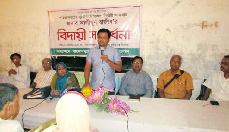 শামছুর রহমান শিশির, শাহজাদপুর থেকে : গত বৃহস্পতিবার সন্ধ্যায় ইব্রাহিম পাইলট বালিকা উচ্চ বিদ্যালয় হল রুমে শাহজাদপুর উপজেলা নির্বাহী অফিসার আলীমুন রাজীবের এক বিদায়ী সংবর্ধনা প্রদান করা হয়। উক্ত সংবর্ধনা অনুষ্ঠানে প্রধান অতিথি হিসেবে বক্তব্য রাখেন, বিদায়ী উপজেলা নির্বাহী অফিসার আলীমুন রাজীব, রবীন্দ্র গবেষক প্রফেসর নাছিমউদ্দিন মালিথার সভাপতিত্বে বক্তব্য রাখেন, আইনজীবী সমিতির সভাপতি এ্যাডভোকেট আনোয়ার হোসেন, সাংস্কৃতিক ব্যক্তিত্ব ওস্তাদ শ্যামল কুমার সাহা, কাজী শওকত হোসেন, হাসান মাহবুব ফেরদৌস, সাংবাদিক আতাউর রহমান পিন্টু, এআর সিদ্দিকি প্রমুখ। সংবর্ধনা অনুষ্ঠানে মানপত্র পাঠ করেন, অধ্যক্ষ কামরুন নাহার লাকী, এ সময় কবিতা আবৃতি পাঠ করেন আতিকা তাসনিম অহনা। উল্লেখ্য, বিদায়ী উপজেলা নির্বাহী অফিসার বগুড়া জেলার অতিরিক্ত জেলা প্রশাসক হিসেবে তার পদোন্নতি হয়। উপজেলা সাংস্কৃতি ঐক্য পরিষদ এ সংবর্ধনার আয়োজন করে। শেষে এক মনোজ্ঞ সাংস্কৃতিক অনুষ্ঠান পরিবেশন করা হয়।