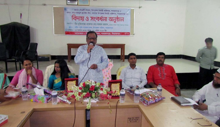 ফারুক হাসান কাহার শাহজাদপুর (সিরাজগঞ্জ) প্রতিনিধি: শাহজাদপুরে সাবেক উপজেলা নির্বাহী অফিসার শেহেলী লায়লা ও নবাগত উপজেলা নির্বাহী অফিসার নাজমুল হুসাইন খান এর সংবর্ধনা অনুষ্ঠান উপলক্ষে আজ সোমবার শাহজাদপুর শহীদ স্মৃতি সম্মেলন কক্ষে এক আলোচনা সভা অনুষ্ঠিত হয়। উপজেলা পরিষদের চেয়ারম্যান প্রফেসর আজাদ রহমানের সভাপতিত্বে বক্তব্য রাখেন সদ্য বিদায়ী উপজেলা নির্বাহী অফিসার শেহেলী লায়লা ও নবাগত উপজেলা নির্বাহী অফিসার নাজমুল হুসাইন খান। এ সময় অন্যান্যদের মধ্যে বক্তব্য রাখেন, সহকারি কমিশনার (ভূমি) মোহাম্মদ হাসিব সরকার, অতিরিক্ত পুলিশ সুপার শাহজাদপুর সার্কেল ফাহমিদা হক শেলী, ভাইস চেয়ারম্যান মুস্তাক আহমেদ, উপজেলা প্রকল্প বাস্তবায়ন কর্মকর্তা জিন্দার আলী প্রমুখ। উক্ত বিদায় ও সংবর্ধনা অনুষ্ঠানে শাহজাদপুরের প্রশাসনের সকল কর্মকর্তা ও কর্মচারী উপস্থিত ছিলেন।
