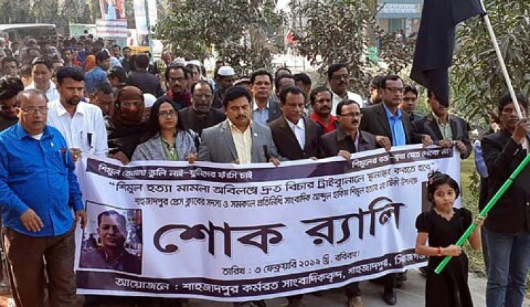 নিজস্ব প্রতিবেদক : শিমুল হত্যা মামলা দ্রুত বিচার ট্রাইব্যুনালে স্থানান্তর ও অবিলম্বে বিচার কাজ শুরু করার দাবি জানানোর মধ্যে দিয়ে আজ রোববার শাহজাদপুরে সমকালের স্থানীয় প্রতিনিধি আব্দুল হাকিম শিমুল হত্যার ২য় বার্ষিকী পালিত হয়েছে। এ উপলক্ষে শাহজাদপুরে কর্মরত সাংবাদিকবৃন্দ দিনব্যাপি নানা কর্মসূচির আয়োজন করা হয়। কর্মসূচির মধ্যে ছিল কালো পতাকা উত্তোলণ ও কালো ব্যাচ ধারণ, নিহতের কবর জিয়ারত ও তার প্রতিকৃতিতে শ্রদ্ধা নিবেদন, শোক র‌্যালি, মানববন্ধন, স্মরণ সভা ও মিলাদ মাহফিল । সকাল ৯টায় শাহজাদপুর প্রেস ক্লাবে কালো পতাকা উত্তোলন ও কালো ব্যাচ ধারণের মধ্যে দিয়ে দিনের কর্মসূচি শুরু হয়। সকাল সাড়ে ১০ টায় উপজেলা পরিষদ চত্বর থেকে এক বিশাল শোক র‌্যালি বের হয়ে শহরের বিভিন্ন সড়ক প্রদক্ষিণ করে। শোক র‌্যালিতে ঢাকা, পাবনা, সিরাজগঞ্জ থেকে আগত ও স্থানীয় গণমাধ্যমকর্মী, শিক্ষক, মুক্তিযোদ্ধা, জনপ্রতিনিধি, নিহতের পরিবারের সদস্যবৃন্দ সহ নানা শ্রেণী পেশার শত শত মানুষ অংশ নেন। র‌্যালি শেষে উপজেলা পরিষদের শহীদ স্মৃতি সম্মেলন কক্ষে স্মরণ সভা অনুষ্ঠিত হয়। এতে প্রধান অতিথি হিসেবে উপস্থিত ছিলেন, উপজেলা পরিষদের চেয়ারম্যান প্রফেসর আজাদ রহমান। প্রধান আলোচক হিসেবে উপস্থিত ছিলেন সমকালের অতিরিক্ত বার্তা সম্পাদক তপন দাশ। অনুষ্ঠানে বিশেষ অতিথি হিসেবে উপস্থিত ছিলেন, সহকারি কমিশনার (ভূমি) মোহাম্মদ হাসিব সরকার ও উপজেলা পরিষদের ভাইস চেয়ারম্যান মুস্তাক আহমেদ। শাহজাদপুর প্রেস ক্লাবের সাধারণ সম্পাদক শফিকুজ্জামান শফির সভাপতিত্বে অনুষ্ঠিত স্মরণ সভায় অন্যান্যদের মধ্যে বক্তব্য রাখেন বিশিষ্ট শিক্ষাবিদ উপজেলা দূর্নীতি প্রতিরোধ কমিটির সভাপতি এ, এম, আব্দুল আজিজ, উপজেলা মানবাধিকার কমিশনের সভাপতি অধ্যক্ষ গোলাম সাকলায়েন, থানার পুলিশ পরিদর্শক (তদন্ত) কে, এম, রাকিবুল হুদা, পাবনা সাংবাদিক ইউনিয়নের সভাপতি আব্দুল হামিদ খান, সিরাজগঞ্জ প্রেস ক্লাবের অর্থ বিষয়ক সম্পাদক ও আরটিভির স্টাফ রিপোর্টার সুকান্ত সেন, সমকালের স্টাফ রিপোর্টার এ, বি, এম, ফজলুর রহমান, শাহজাদপুর প্রেস ক্লাবের সভাপতি বিমল কুন্ডু, সহ-সভাপতি আবুল কাশেম, সাংবাদিক আতাউর রহমান পিন্টু, এম, এ, জাফর লিটন, হাসানুজ্জামান তুহিন, আল-আমিন হোসেন, অধ্যক্ষ শহিদুল ইসলাম শাহিন, বিআরডিবি’র চেয়ারম্যান লুৎফর রহমান, সাংস্কৃতিক কর্মী কাজী শওকত, সমকালের সিরাজগঞ্জ প্রতিনিধি আমিনুল ইসলাম খান রানা, উল্লাপাড়া প্রতিনিধি কল্যাণ ভৌমিক, তাড়াশ প্রতিনিধি আতিকুল ইসলাম বুলবুল, রায়গঞ্জ প্রতিনিধি তাপস কুমার ঘোষ, ছাত্রলীগের সাবেক সভাপতি শেখ কাজল, যুবলীগ নেতা আশিকুল হক দিনার, স্বেচ্ছাসেবকলীগ আল-আমিন প্রমুখ। বক্তারা ক্ষোভের সাথে বল