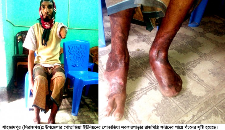 সিরাজগঞ্জের শাহজাদপুর উপজেলার পোতাজিয়া ইউনিয়নের পোতাজিয়া সরকারপাড়া মহল্লার সাত্তার প্রামাণিকের ছেলে রাজমিস্ত্রি ফরিদ প্রামাণিক (৩৫) এর দিন ভালোই চলছিলো। কিন্তু নিয়তির নির্মম পরিহাসে প্রায় ৫ বছর পূর্বে পৌর এলাকার দরগাহপাড়া গ্রামের জনৈক মানিকের বিল্ডিংয়ের ৫ তলায় রাজমিস্ত্রির কাজ করার সময় বিদ্যুৎস্পৃৃষ্ট হয়ে কোনমতে প্রাণে বেঁচে গেলেও তাকে হারাতে হয় বা হাত, বা পায়ের সবগুলো আঙ্গুল ও ডান পায়ের ৩ টি আঙ্গুল। পোতাজিয়া সরকারপাড়া মহল্লার আজাদের বাড়িতে আশ্রিত ফরিদ এলাকাবাসীর সহযোগীতায় তার স্ত্রী, ১ ছেলে ১ মেয়ে নিয়ে খেয়ে না খেয়ে মানবেতর দিনযাপন করে আসছে। দুর্র্ঘটনার পর থেকেই অসহায় ফরিদকে দৈনিক আড়াই’শ টাকার ওষুধ খেতে হচ্ছে এবং প্রতিমাসে নিয়মিত একবার ঢাকায় চেকআপের জন্য যেতে হচ্ছে। পরিবারের ভরণপোষণের ব্যয় বহনই যেখানে ফরিদের জন্য অন্তরায় হয়ে দাঁড়িয়েছে, সেখানে অর্থাভাবে ঠিকমতো চিকিৎসা করতে না পারায় বর্তমানে তার দুটি পা ক্রমশঃ ফুলে যাচ্ছে এবং বা পায়ে পঁচন ধরেছে। এজন্য, বিশেষজ্ঞ চিকিৎসক তার পঁচন ধরা বা পায়ে অপারেশনের পরামর্শ দিয়েছেন। জরুরী ভিত্তিতে ফরিদের পা অপারেশন করা না গেলে পঁচন থেকে সে ক্যান্সারে আক্রান্ত হতে পারে। এমনকি পুরো পা কেটে ফেলা হতে পারে বলে বিশেষজ্ঞ চিকিৎসক জানিয়েছেন। অর্থাভাবে অসহায় ফরিদ অপারেশনসহ চিকিৎসা ব্যয় নির্বাহ করতে অক্ষম হওয়ায় তিনি দেশ বিদেশের বিত্তবান ও সুহৃদের নিকট সাহায্যের মানবিক আবেদন জানিয়েছে। ফরিদের ব্যক্তিগত মোবাইল ফোন ০১৯৩৯-০৪৮১৫৬ (বিকাশ পার্সোনাল) নাম্বারে সে আর্থিক সহযোগীতার দাবী জানিয়েছে। সকলের সহযোগীতায় সে ফরিদ বাঁচতে চায়!