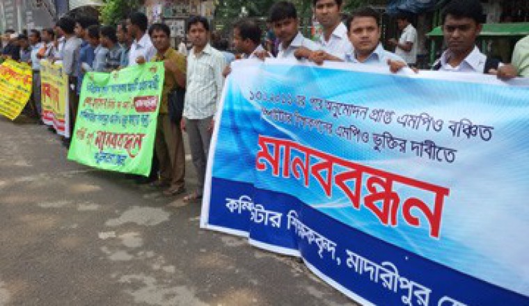 শাহজাদপুর সংবাদ ডটকম :- সরকারি বেতনভাতা বঞ্চিত কমপিউটার শিক্ষক সংগ্রাম কমিটির পক্ষ থেকে ঢাকায় মানব বন্ধন পালিত হয়েছে। মানববন্ধন শেষে শিক্ষকেরা কমপিউটার বিষয়ে শর্ত শিথিল করে কমপিউটার শিক্ষকদের এমপিওভুক্তসহ বেতনভাতা প্রদানের দাবীতে শিক্ষা মন্ত্রীর মাধ্যমে প্রধানমন্ত্রী বরাবরে একটি স্মারক লিপি পেশ করেছেন। বর্তমান আওয়ামীলীগ নেতৃত্বাধীন জোট সরকার ডিজিট্যাটাল বাংলাদেশ গড়ার লক্ষ্যে তথ্য ও যোগাযোগ প্রযুক্তি শিক্ষার ওপর অধকি গুরুত্ব আরোপ করছেনে ।কিন্তু শিক্ষকরা দু:খ প্রকাশ করে বলেছেন যে, ডিজিটাল বাংলাদেশ গড়ার কারিগর ‘কম্পিউটার শিক্ষক’দের বেতন ভাতা না দিয়ে কম্পিউটার বিষয় খোলার অনুমোদনের ক্ষেত্রে শর্ত আরোপ করা হয়েছে। জানাগেছে, সরকারী বিধি অবলম্বন করে প্রতিটি স্কুলে একজন করে কম্পিউটার শিক্ষক নিয়োগ দেওয়া হয়েছে। নিয়োগ বিধি অনুযায়ী সকল কম্পিউটার শিক্ষকবৃন্দ নিয়োগ প্রাপ্ত হয়েছেন। কিন্তু যৌক্তিভাবে নিয়োগ দেয়ার পরও অজ্ঞাত কারনে শিক্ষকদের সরকারি সকল সুযোগ সুবিধা থেকে বঞ্চিত রাখা হয়েছে। এদিকে অধিকাংশ শিক্ষা প্রতিষ্ঠানে কমপিউটার শিক্ষকদের বেতনভাতা প্রদান করা হচ্ছে। পক্ষান্তরে গুটিকয়েক শিক্ষা প্রতিষ্ঠানের কম্পিউটার শিক্ষকদের সরকারী বেতন –ভাতা প্রদান করা হয় না। কিন্ত ঐ শিক্ষা প্রতিষ্ঠানগুলিতে সরকারের সকল বিধি-বিধান মেনে নিয়েই শিক্ষকদের নিয়োগ দেয় হয়েছে। নিয়োগপ্রাপ্তরা শিক্ষকরা যথারীতি তাদের দায়িত্ব পালন করছেন। তারা নিয়মিত ৬ষ্ঠ থেকে ১০ শ্রেণী পর্যন্ত আমরা তথ্য ও যোগাযোগ বিষয়ের পাঠদান করে আসছেন।