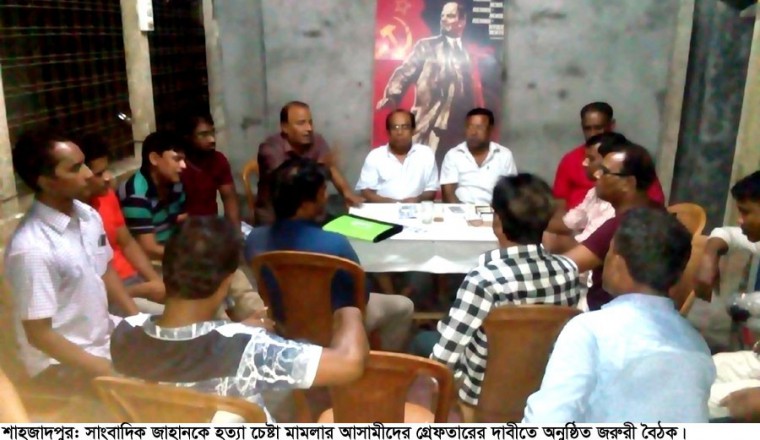 নিজস্ব প্রতিবেদক : আজ শনিবার রাতে পৌরসদরের মণিরামপুর বাজার এলাকাস্থ উপজেলা বাসদ কার্যালয়ে দৈনিক যুগান্তর ও বিজয় টিভির শাহজাদপুর প্রতিনিধি মুমীদুজ্জামান জাহানকে হত্যা চেষ্টা মামলার আসামীদের অবিলম্বে গ্রেফতারের দাবীতে শাহজাদপুরে কর্মরত বিভিন্ন প্রিন্ট ও ইলেকট্রনিক্স মিডিয়ার সাংবাদিকদের জরুরী সভা অনুষ্ঠিত হয়েছে। শাহজাদপুর প্রেসক্লাবের সভাপতি বিমল কুন্ডুর সভাপতিত্বে ও সাধারণ সম্পাদক শফিকুজ্জামান শফির সঞ্চালনায় অনুষ্ঠিত ওই জরুরী সভায় সাংবাদিক মুমীদুজ্জামান জাহানকে হত্যা চেষ্টাকারী মামলার আসামী চিহ্নিত তেলচোর চক্রের সদস্যদের অবিলম্বে গ্রেফতারের দাবী জানিয়ে ও ওই ন্যাক্কারজনক ঘটনার তীব্র প্রতিবাদ জানিয়ে বক্তব্য রাখেন, শাহজাদপুর বার্তা’র সম্পাদক ও শাহজাদপুর আইনজীবী সমিতির সভাপতি এড. আনোয়ার হোসেন, দৈনিক ভোরের কাগজ’র স্থানীয় প্রতিনিধি এড. কবীর আজমল বিপুল, জনকন্ঠের নিজস্ব সংবাদদাতা সৈয়দ হুমায়ুন পারভেজ শাব্বির, প্রতিদিনের সংবাদের হাসানুজ্জামান তুহিন, শাহজাদপুর সাংবাদিকতা ও সামাজিক উন্নয়ন ফোরামের সাধারণ সম্পাদক ওমর ফারুক, সিনিয়র সহ-সভাপতি দিনকালের আল-আমিন হোসেন, যুগ্ম সাধারণ সম্পাদক, সাপ্তাহিক জনতার মশাল’র ব্যবস্থাপনা সম্পাদক শামছুর রহমান শিশির, সাংগঠনিক সম্পাদক, ভোরের পাতার প্রতিনিধি মামুন বিশ্বাস, শাহজাদপুর সাংবাদিক ইউনিয়ন সভাপতি, সাপ্তাহিক উত্তর দিগন্ত’র সম্পাদক এম.এ জাফর লিটন, দৈনিক সকালের সংবাদের গোলাম সরোয়ার, ভোরের ডাকের জেলহক হোসাইন, আমার সংবাদের জহুরুল ইসলাম, সাতমাথার আবুল হাসনাত টিটু, নবচেতনা’র প্রতিনিধি মাসুদ মোশাররোফ প্রমূখ। বক্তারা অবিলম্বে আসামীদের গ্রেফতার ও দৃষ্টান্তমূলক শাস্তির দাবী জানিয়ে বলেন, ‘পেশাগত দায়িত্ব পালনকালে সাংবাদিক জাহান আহত হয়েছেন। এ ঘটনায় শাহজাদপুর থানায় মামলা হয়েছে। এ মামলা দায়েরের প্রায় এক সপ্তাহ কেটে গেলেও পুলিশ এখনও পর্যন্ত কোন আসামীকে গ্রেফতার করতে পারেনি। অথচ আসামীরা বাঘাবাড়ী ওয়েল ডিপো এলাকায় প্রকাশ্যে ঘুরে বেড়াচ্ছে এবং মামলা তুলে নেয়ার জন্য বিভিন্নভাবে চাপ সৃষ্টি করছে। পুলিশ বলছে তাদের বাড়িতে পাওয়া যাচ্ছে না। তাই গ্রেফতার সম্ভব হচ্ছে না। অযৌক্তিক ওই অযুহাতের তীব্র নিন্দা জানিয়ে সাংবাদিকরা আসামীদের গ্রেফতারের দাবীতে সিরাজগঞ্জ পুলিশ সুপার বরাবর স্মারকলিপি প্রদান করবেন বলে সর্বসম্মতিক্রমে সিদ্ধান্ত নেন। এর পরেও আসামীদের গ্রেফতার করা না হলে বিক্ষোভ সমাবেশ, মানববন্ধনসহ লাগাতার কর্মসূচী ঘোষণা করবেন বলে জানান। উল্লেখ্য, গত ১৬ জুলাই রোববার দুপুরে বাঘাবাড়ি ওয়েল ডিপোর গেটের ভিতরে ট্যাংকলরী থেকে তেল চুরির ছবি তোলায় যমুনা ওয়েল কোম্প