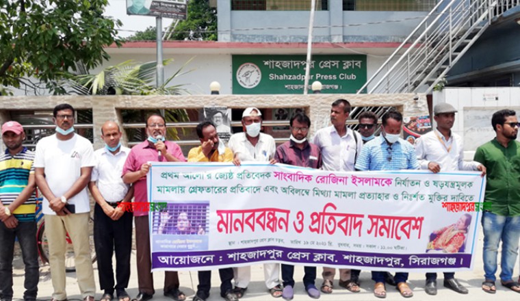 অনুুুুসন্ধানী সাংবাদিকতায় আন্তর্জাতিকভাবে খ্যাতি অর্জন করা দৈনিক প্রথম আলোর জ্যেষ্ঠ প্রতিবেদক রোজিনা ইসলামকে বিরুদ্ধে মিথ্যা মামলা প্রত্যাহার ও মুক্তির দাবিতে শাহজাদপুরে মানববন্ধন ও প্রতিবাদ সমাবেশ অনুষ্ঠিত হয়েছে। আজ বুধবার (১৯মে) সকালে শাহজাদপুর প্রেসক্লাবের উদ্যোগে প্রেসক্লাবের সামনের সড়কে ঘন্টা ব্যাপী এ মানববন্ধন ও প্রতিবাদ কর্মসূচী পালন করেন উপজেলার গণমাধ্যমকর্মীরা। শাহজাদপুর প্রেসক্লাবের সভাপতি বিমল কুন্ডুর সভাপতিত্বে অনুষ্ঠিত উক্ত মানববন্ধন ও প্রতিবাদ সভায় বক্তব্য রাখেন, সাংবাদিক শফিকুজ্জামান শফি (দৈনিক মানবকন্ঠ), হাসানুজ্জামান তুহিন (দৈনিক প্রতিদিনের সংবাদ), আবুল কাশেম (দৈনিক নয়া দিগন্ত), ওমর ফারুক (এশিয়ান টিভি), আল আমিন হোসেন (দৈনিক দিনকাল), মুস্তাক আহমেদ (সম্পাদক সাপ্তাহিক প্রান্তিক সংবাদ), রাসেল সরকার (দৈনিক নবচেতনা), মিঠুন বসাক (দৈনিক আলোকিত সকাল), এমএ জাফর লিটন (দৈনিক যায়যায়দিন), জহুরুল ইসলাম (দৈনিক আমার সংবাদ), মোঃ মুমীদুজ্জামান জাহান (দৈনিক দেশ রূপান্তর), মনিরুল গণি চৌধুরি শুভ্র (অভিযাত্রা), মাসুদ মোশারফ (দৈনিক আজকালের খবর), জাকারিয়া মাহমুদ (মাই টিভি), মির্জা হুমাইয়ুন (দৈনিক তৃতীয় মাত্রা) সহ শাহজাদপুরে উপজেলায় কর্মরত বিভিন্ন ইলেক্ট্রনিক ও প্রিন্ট মিডিয়ার সংবাদকর্মীরা উপস্থিত ছিলেন। উক্ত মানববন্ধনে বক্তারা বলেন, প্রথম আলোর সিনিয়র সাংবাদিক রোজিনা ইসলামের সঙ্গে যে আচরণ করা হয়েছে তা ন্যাক্কারজনক। এ ঘটনায় সাংবাদিকেরা উদ্বিগ্ন, ক্ষুব্ধ ও বিস্মিত। স্বাস্থ্য মন্ত্রণালয়ে পেশাগত দায়িত্ব পালন করতে গিয়ে দুর্নীতিবাজ কর্মকর্তারা সাংবাদিক রোজিনা ইসলামকে প্রায় ৬ঘন্টা ধরে আটকে রেখে হেনস্তা করেও ক্ষান্ত হয়নি। মিথ্যা মামলাও দিয়েছে। মানববন্ধনে এহেন ন্যাক্কারজনক ঘটনার তীব্র নিন্দা ও প্রতিবাদ জানানো হয় এবং এসব দুর্নীতিবাজ কর্মকর্তাদের গ্রেফতার ও সাংবাদিক রোজিনা ইসলামের নিঃশর্ত মুক্তি দাবী করা হয়। সেইসাথে সকল সাংবাদিক ভাই-বোনদের ঐক্যবদ্ধ হওয়ার উদাত্ত আহ্বান জানানো হয়। উক্ত ঘটনার প্রেক্ষিতে শাহজাদপুর সংবাদ ডটকম এর প্রধান সম্পাদক বীর ‍মুক্তিযোদ্ধা আবুল বাশার ও ব্যবস্থাপনা সম্পাদক শরীফ সরকার এ ঘটনার তীব্র নিন্দা জ্ঞাপন করেছেন। উল্লেখ্য, সাংবাদিক রোজিনা ইসলাম পেশাগত দায়িত্ব পালনের জন্য সচিবালয়ে স্বাস্থ্য মন্ত্রণালয়ে যান। সেখানে বিকেল তিনটার দিকে মন্ত্রণালয়ের কর্মকর্তারা তাকে একটি কক্ষে আটক করেন। পরে রাত সাড়ে ৮টার দিকে রোজিনা ইসলামকে শাহবাগ থানার পুলিশের কাছে হস্তান্তর করা হয়। রোজিনা ইসলামকে ৯টার দিকে শাহবাগ থানায় নিয়ে যায় পুলিশ। পরে মঙ্গলবার আদালতে হাজির করা হলে বিজ্ঞ আদালত রিমা