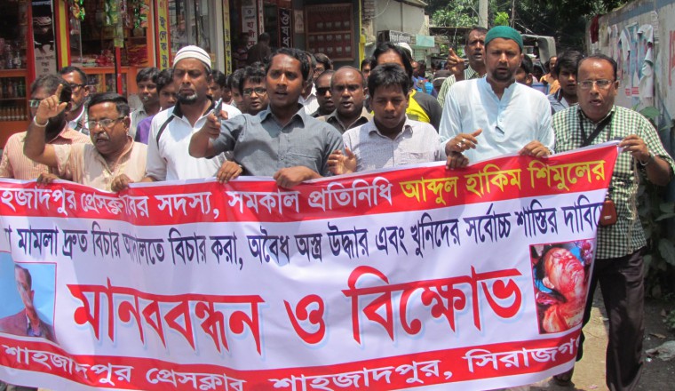 নিজস্ব প্রতিবেদক : সাংবাদিক শিমুল হত্যা মামলা দ্রুত বিচার ট্রাইব্যুনালে স্থানান্তর, অবৈধ অস্ত্র উদ্ধার ও খুনিদের সর্বোচ্চ শাস্তি নিশ্চিত করার দাবিতে আজ মঙ্গলবার শাহজাদপুরে কর্মরত সাংবাদিকেরা মানববন্ধন ও বিক্ষোভ সমাবেশ করেছে। শাহজাদপুর প্রেসক্লাবের উদ্যোগে এ কর্মসূচী পালিত হয়। সকাল সাড়ে ১০ টা থেকে সাড়ে ১১ টা পর্যন্ত পৌর এলাকার প্রাণকেন্দ্র মণিরামপুর বাজারের চৌরাস্তায় ঘন্টাব্যাপী মানববন্ধন পালন করা হয়। মানববন্ধন চলাকালে বক্তব্য রাখেন, শাহজাদপুর প্রেসক্লাবের সভাপতি বিমল কুন্ডু, সাধারণ সম্পাদক শফিকুজ্জামান শফি, সাংবাদিকতা ও সামাজিক উন্নয়ন ফোরামের সাধারণ সম্পাদক ওমর ফারুক, সাংবাদিক সৈয়দ হুমায়ুন পারভেজ শাব্বির, হাসানুজ্জামান তুহিন, সাগর বসাক, আল আমিন হোসেন, শামছুর রহমান শিশির, সমকালের জেলা প্রতিনিধি আমিনুল ইসলাম খান রানা, যমুনা টিভির জেলা প্রতিনিধি ও বেলকুচি প্রেসক্লাবের যুগ্ম-সাধারণ সম্পাদক গোলাম মোস্তফা রুবেল, এমএ জাফর লিটন, সাংস্কৃতিক কর্মী কাজী শওকত প্রমূখ। বক্তারা সাংবাদিক শিমুল হত্যা মামলার দ্রুত বিচার ট্রাইব্যুনালে স্থানান্তর, অবৈধ অস্ত্র উদ্ধার, এজাহারভূক্ত সকল আসামীদের গ্রেফতার এবং খুনিদের সর্বোচ্চ শাস্তি ফাঁসির দাবি জানান। মানববন্ধন শেষে এক বিক্ষোভ মিছিল পৌর এলাকার প্রধান প্রধান সড়ক প্রদক্ষিণ শেষে প্রেসক্লাব চত্বরে এসে শেষ হয়। মানববন্ধন ও বিক্ষোভ সমাবেশে সাংবাদিক, বিভিন্ন রাজনৈতিক, সামাজিক ও সাংস্কৃতিক সংগঠনের নেতৃবৃন্দসহ নানা শ্রেণিপেশার শত শত মানুষ স্বতস্ফুর্তভাবে অংশ নেন।
