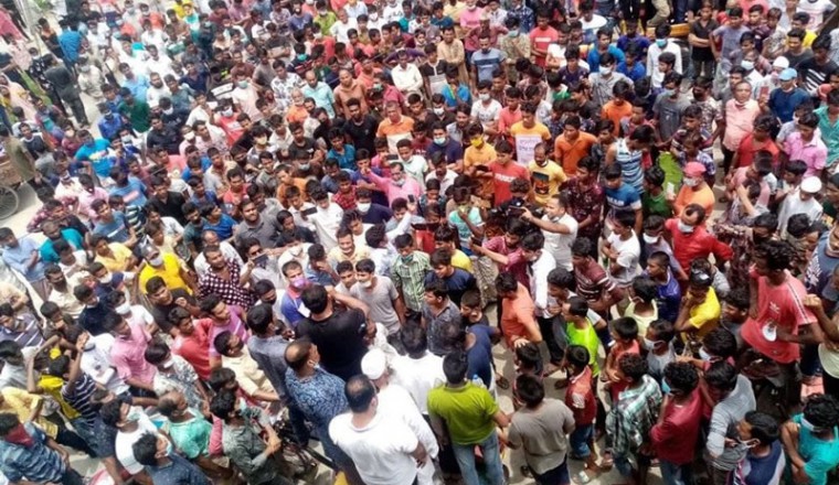 করোনাভাইরাসের সংক্রমণরোধে মিছিল-সমাবেশ নিষিদ্ধ করার পাশাপাশি নানা বিধিনিষেধ আরোপ করা হলেও তা উপেক্ষা করে বৃহস্পতিবার কয়েক হাজার মানুষের উপস্থিতিতে মানববন্ধন ও সমাবেশ করেছে সিরাজগঞ্জের বেলকুচি উপজেলা যুবলীগ। করোনাভাইরাস সংক্রমণে দ্বিতীয় অবস্থানে থাকা বেলকুচি উপজেলা সদরে স্বাস্থ্য বিধি না মেনে এমন জনসমাগম আতঙ্কিত এবং ক্ষুব্দ করে তুলেছে এলাকাবাসীকে। বৃহস্পতিবার দুপুরে বেলকুচি উপজেলার চালা বাসষ্ট্যান্ড এলাকায় মানববন্ধন শেষে দলীয় কার্যালয়ের সামনে এই সমাবেশ ও মানববন্ধন অনুষ্ঠিত হয়। উপজেলা যুবলীগের আহবায়ক সাজ্জাদুল হক রেজার ওপর সন্ত্রাসী হামলার অভিযোগ এনে সাবেক মন্ত্রী ও জেলা আওয়ামী লীগের সভাপতি আব্দুল লতিফ বিশ্বাসের বিরুদ্ধে এ মানববন্ধনের আয়োজন করে উপজেলা যুবলীগ। পুলিশী পাহাৱায় বেলকুচি পৌরসভার চালা বাসষ্ট্যান্ড এলাকায় প্রায় এক ঘন্টাব্যাপী মানববন্ধন শেষে বেলকুচি উপজেলা আওয়ামী লীগ কার্যালয়ের সামনে সমাবেশ অনুষ্ঠিত হয়। সমাবেশ চলাকালে সামাজিক দূরত্ব বজায় রাখা দূরের কথা গাদাগাদি করে অবস্থান করছিল অনেকে। অনেকের মুখে মাস্ক পরতেও দেখা যায়নি। বেলকুচি উপজেলা যুবলীগের আহবায়ক সাজ্জাদুল হক রেজা জানান, আমরা প্রথমে চালা এলাকায় মানববন্ধন করি। কিন্তু সাধারণ মানুষ আমাদের সাথে সংহতি প্রকাশ কৱায় লোক সংখ্যা বেড়ে প্রায় ৫/৬ হাজারে পৌঁছে। পরে পার্টি অফিসের সামনে আমরা সমাবেশ করি। বেলকুচি উপজেলা নির্বাহী কর্মকর্তা (ভারপ্রাপ্ত) জাহাঙ্গীর আলম জানান এ ধরনের মানববন্ধন ও সমাবেশের বিষয়ে কোনো অনুমোদন নেয়া হয়নি। থানার ওসিকে বিষয়টি খতিয়ে দেখার জন্য বলা হয়েছে। এ ব্যাপারে বেলকুচি থানার ভারপ্রাপ্ত কর্মকর্তা( ওসি) আনোয়ারুল ইসলামের সাথে যোগাযোগের চেষ্টা করা হলেও মোবাইল ফোনে তাকে পাওয়া যায়নি। এ ব্যাপারে জেলা যুবলীগের সাধারন সম্পাদক মো. একরামুল হক জানান, করোনা মহামারীর মধ্যে সব ধরনের মিছিল সমাবেশ নিষিদ্ধ ঘোষণা করেছে সরকার। সাজ্জাদুল হক রেজা মানববন্ধন সমাবেশ করে সংগঠন বিরোধী কার্যক্রম করেছে। জেলা যুবলীগের সভাপতি রাশেদ ইউসুফ জুয়েল বলেন, এটা দলীয় কোন প্রোগ্রাম ছিল না। এ কারণে বিষয়টি আমার জানা ছিল না। জেলা আওয়ামী লীগেৱ সভাপতি সাবেক মন্ত্রী আব্দুল লতিফ বিশ্বাস বলেন, সাজ্জাদুল হক রেজা কতিপয় সন্ত্রাসীর মাধ্যমে স্থানীয় তাঁত শ্রমিক ও সাধারণ মানুষকে টাকায় ভাড়া করে এই জমায়েত করেছে। এভাবে কয়েক হাজার লোক সমবেত করায় পুরো বেলকুচি উপজেলা জুড়ে করোনা সংক্রমণের আশঙ্কা দেখা দিয়েছে। সিরাজগঞ্জের পুলিশ সুপার মো. হাসিবুল আলম জানান বেলকুচিতে যুবলীগ মানববন্ধন করেছে। মানববন্ধনে অংশগ্রহণকারীরা যাতে আইনশৃংখলার কোন অবনত