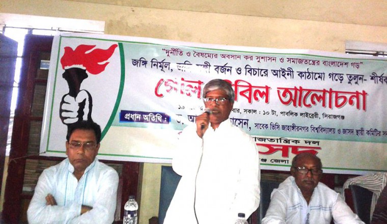 সিরাজগঞ্জ প্রতিনিধি : গতকাল শনিবার সকাল ১০ টা থেকে দুপুর ২টা পর্যন্ত সিরাজগঞ্জ জেলা জাসদের উদ্যোগে ‘জঙ্গি নির্মূল, জঙ্গি-সঙ্গী বর্জন ও বিচারে আইনি কাঠামো গড়ে তুলুন’ শীর্ষক এক গোলটেবিল আলোচনা সভা অনুষ্ঠিত হয়েছে। এতে প্রধান অতিথি হিসেবে আলোচনা করেন জাসদ স্থায়ী কমিটির সদস্য জাহাঙ্গীরনগর বিশ্ববিদ্যালয়ের সাবেক ভিসি, বিশিষ্ট শিক্ষাবিদ ড. মো. আনোয়ার হোসেন। সিরাজগঞ্জ পাবলিক লাইব্রেরি মিলনায়তনে অনুষ্ঠিত আলোচনা সভায় সভাপতিত্ব করেন জাসদ কেন্দ্রীয় কমিটির সহ-সভাপতি ও সিরাজগঞ্জ জেলা জাসদের সভাপতি বীর মুক্তিযোদ্ধা আব্দুল হাই তালুকদার। জেলা জাসদের সাধারণ সম্পাদক নাজমুল ইসলাম মুকুলের সঞ্চালনায় অনুষ্ঠিত বৈঠকে মূল প্রবন্ধ উপস্থাপন করেন জেলা জাসদের সহ-সভাপতি আবু বকর ভূঁইয়া। এতে বিশেষ অতিথি হিসেবে আলোচনা করেন, জাসদ কেন্দ্রীয় কমিটির সাংস্কৃতিক সম্পাদক আব্দুর রাজ্জাক। বিভিন্ন শ্রেণি-পেশার প্রতিনিধিদের অংশগ্রহনে অনুষ্ঠিত ওই গোলটেবিল আলোচনায় আরো অংশগ্রহন করেন, সাবেক ছাত্রনেতা ও সিরাজগঞ্জ সরকারি রাশিদাজ্জোহা মহিলা কলেজের সাবেক অধ্যক্ষ আখতারুজ্জামান, দৈনিক যমুনা প্রবাহের সম্পাদক মোস্তফা কামাল, সিরাজগঞ্জ জেলা এনজিও সমন্বয় পরিষদের সভাপতি জাহাঙ্গীর আলম রতন, জেলা আইনজীবী সমিতির সাবেক সভাপতি এড. নূরুল আমিন রুনু, বর্তমান সাধারণ সম্পাদক এড. নাসিম সরকার, সম্মিলিত সাংস্কৃতিক জোট সিরাজগঞ্জের সভাপতি আসাদ উদ্দিন পবলু, সম্মিলিত সাংস্কৃতিক জোট রাজশাহী বিভাগীয় সাংগঠনিক সম্পাদক মোমিন বাবু প্রমূখ। বক্তারা বলেন, বাংলাদেশকে শান্তি,উন্নয়ন ও গণতন্ত্রের পথে এগিয়ে নিয়ে যেতে হলে, জঙ্গি নির্মূল, জঙ্গি-সঙ্গীদের বর্জন করতে হবে। বিএনপি জামায়াতসহ ধর্মভিত্তিক সাম্প্রদায়িক দলগুলির মদদে দেশে জঙ্গিবাদ মাথাচারা দিয়ে উঠেছে। গণতন্ত্রে যেমন জঙ্গির কোন স্থান নেই, তেমনি জঙ্গি উৎপাদন-পুনরুৎপাদনকারীরও কোন স্থান নেই। প্রকৃত দেশপ্রেমিক, গণতান্ত্রিক শুভবুদ্ধি সম্পন্ন সকল রাজনৈতিক শক্তি-ব্যাক্তিকে জঙ্গিবাদ নির্মূলের অভিযানে পাশে দাঁড়াতে হবে এবং জঙ্গি ও জঙ্গি-সঙ্গীকেও রাজনৈতিকভাবে বর্জন করতে হবে।
