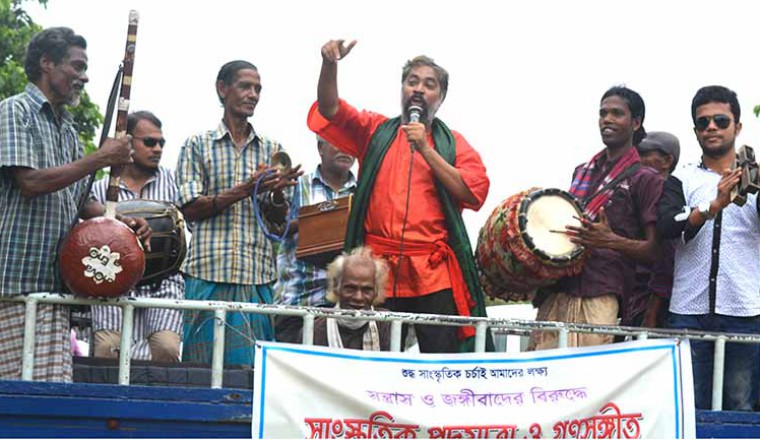 সিরাজগঞ্জ সংবাদদাতা:: গত বৃহস্পতিবার সকালে সিরাজগঞ্জ সাংস্কৃতিক ফোরাম সন্ত্রাস ও জঙ্গীবাদের বিরুদ্ধে সাংস্কৃতিক কর্মীদের পদযাত্রা ও গণসঙ্গীতের আয়োজন করে। সিরাজগঞ্জ সরকারি কলেজ শহীদ মিনারের পাদদেশ থেকে এই পদযাত্রা শুরু হয়ে শহরের প্রধান প্রধান সড়ক প্রদক্ষিন করে জেলার কেন্দ্রীয় শহীদ মিনার মুক্তির সোপানে এসে শেষ হয়। এ সময় পদযাত্রায় অংশ গ্রহনকারী সাংস্কৃতিক কর্মীরা দেশাত্ববোধক গান ও কবিতা আবৃত্তি করেন। এ ছাড়া ট্রাকের ভ্রাম্যমান মঞ্চে গণসঙ্গীত পরিবেশন করা হয়। পদযাত্রায় সাংস্কৃতিককর্মী,শিক্ষার্থী,কর্মজীবী পেশাজীবীসহ সর্বস্তরের মানুষ অংশ গ্রহন করেন। এ পদযাত্রা শুরুর আগে সিরাজগঞ্জ সাংস্কৃতিক ফোরামের আহবায়ক জান্নাত আরা তালুকদার হেনরীর সভাপতিত্বে এবং সদস্যসচিব দিলীপ গৌরের পরিচালনায় এক প্রতিবাদ সমাবেশ অনুষ্ঠিত হয়।