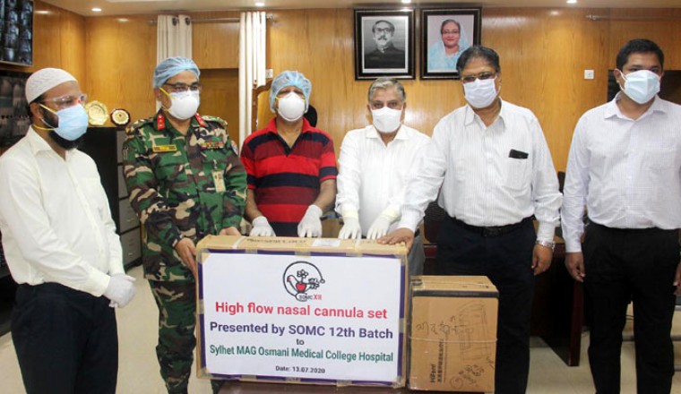 সিলেট: আরও একটি হাই ফ্লো ন্যাজাল ক্যানোলা পেলো সিলেট এমএজি ওসমানী মেডিক্যাল কলেজ (সিওমেক)। মঙ্গলবার (১৪ জুলাই) সিওমেক’র ১২তম ব্যাচের শিক্ষার্থীরা রোগীদের সেবায় একটি হাই ফ্লো ন্যাজাল ক্যানোলা দেন। এ নিয়ে চারটি হাই ফ্লো ন্যাজাল ক্যানোলা মেশিন পেলো সিওমেক হাসপাতাল। মঙ্গলবার (১৪ জুলাই) বিকেলে সিওমেক হাসপাতালের পরিচালক ব্রিগেডিয়ার জেনারেল মো. ইউনুছুর রহমানের কাছে হাই ফ্লো ন্যাজাল ক্যানোলাটি (এইচএনএফসি মেশিন) হস্তান্তর করা হয়। এ সময় পরিচালক ব্রিগেডিয়ার জেনারেল মো. ইউনুছুর রহমান বলেন, মেশিনটি আইসিইউতে চিকিৎসাগ্রহণকারী করোনা ভাইরাসে আক্রান্ত রোগীদের অত্যন্ত কাজে লাগবে। যা দিয়ে রোগীদের প্রয়োজন মাফিক উচ্চচাপে অক্সিজেন সরবরাহ করা যাবে। তিনি সিলেটবাসীকে আতঙ্কিত না হয়ে স্বাস্থ্যবিধি মেনে চলার আহবান জানিয়ে বলেন, সিলেটবাসীর কল্যাণে চিকিৎসাসেবা দেওয়ার জন্য আমরা সর্বাত্মকভাবে কাজ করে যাচ্ছি। আমাদের প্রস্তুতি, পরিকল্পনা ও চেষ্টা অব্যাহত আছে। হাসপাতালের উপ-পরিচালক ডা. হিমাংশু লাল রায় বলেন, এরআগে চট্টগ্রাম চেম্বার অব কমার্স থেকে একটি, সমাজ কল্যাণ সচিব দু’টি ও মঙ্গলবার ওসমানী মেডিক্যাল কলেজের সাবেক শিক্ষার্থীরা একটি হাই ফ্লো ন্যাজাল ক্যানোলা মেশিন দিলেন। এদিন ১২তম ব্যাচের শিক্ষার্থীদের পক্ষে হাই ফ্লো ন্যাজাল ক্যানোলা মেশিন হস্তান্তর করেন স্বাস্থ্য অধিদপ্তরের সাবেক উপ-পরিচালক (ইপিআই) ডা. সফিকুর রহমান ও সিলেট বিভাগের সাবেক পরিচালক (স্বাস্থ্য) সিলেট ডা. বনদীপ লাল দাস। এ সময় আরও উপস্থিত ছিলেন সিলেট ওসমানী মেডিক্যাল কলেজ হাসপাতালের সহকারী পরিচালক ডা. আবুল কালাম আজাদ ও সার্জারি বিভাগের রেজিস্ট্রার ডা. আদনান চৌধুরী প্রমুখ। উল্লেখ্য, হাই ফ্লো ন্যাজাল ক্যানেলা মেশিন দিয়ে করোনা রোগীদের প্রয়োজন মাফিক উচ্চ চাপে অক্সিজেন সরবরাহ করা যায়। রোগীর প্রয়োজনে সর্বোচ্চ মিনিটে ৭০ লিটার অক্সিজেন সরবরাহ করা যায়। যা ভেন্টিলেশনের চেয়েও বেশি অক্সিজেন সরবরাহ করে। তথ্য সুত্রঃ বাংলানিউজটোয়েন্টিফোর.কম