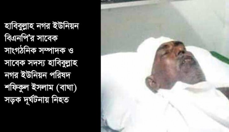 সিরাজগঞ্জের শাহজাদপুর উপজেলার হাবিবুল্লাহ নগর ইউনিয়ন বিএনপি'র সাবেক সাংগঠনিক সম্পাদক সাবেক মেম্বার নগর ডালা নিবাসী শফিকুল ইসলাম (বাঘা) সড়ক দুর্ঘটনায় ইন্তেকাল করেছেন (ইন্না লিল্লিহি ওয়া ইন্না ইলাইহি রাজিউন)। জানা যায় গত বৃহস্পতিবা (০৬ আগষ্ট) রাত্রি ৮ টার সময় ডাইবেটিস এর কারনে করতোয়া ব্রিজে হাটাহাটি করে ব্রিজ এর পুর্ব পার থেকে নিজ বাড়িতে যাওয়ার সময় আয়ুব মেম্বারের মিলের সামনে হঠাৎ করে দ্রুত গতিতে একটি হুন্ডা এসে পিছন থেকে ধাক্কা দিলে পড়ে গিয়ে গুরতর আহত হলে চিকিৎসার জন্য তাকে খাজা ইউনুছ আলী মেডিকেল কলেজ হাসপাতালে ভর্তি করা হয়, আজ সকাল৭.৪০ মিনিটের সময় চিকিৎসাধীন অবস্থায় খাজা ইউনুছ আলী মেডিকেল কলেজ হাসপাতালে ইন্তেকাল করেছেন। তাঁর মৃত্যুতে শোক জানিয়েছেন, জেলা বিএনপি'র প্রধান উপদেষ্ঠা উপজেলা বিএনপি'র আহবায়ক ড.এম এ মুহিত, জেলা বিএনপি'র সহ-সভাপতি হোসাইন শহীদ মাহমুদ গ্যাদন, উপজেলা বিএনপি'র যুগ্ম-আহবায়ক মোঃ ইকবাল হোসেন হিরু, মোঃ আরিফুজ্জান আরিফ প্রমুখ।