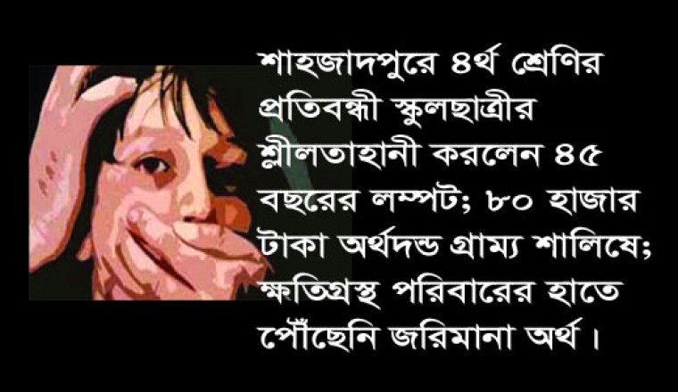 নিজস্ব প্রতিবেদক: এবার ৪৫ বছর বয়সী ৩ সন্তানের জনক, লম্পট এক ভ্যান চালক কর্তৃক ৪র্থ শ্রেণী পড়ুয়া প্রতিবন্ধী স্কুলছাত্রীর (১৩) শ্লীলতাহানীর ঘটনা ঘটেছে। এলাকার প্রভাবশালী গ্রাম্য মাতবররা দেনদরবার করে ভ্যানচালককে অভিযুক্ত করে, ক্ষতিগ্রস্থ প্রতিবন্ধী পরিবারকে ক্ষতিপূরণ দেওয়ার কথা বলে লম্পট ভ্যানচালকের নিকট থেকে ৮০ হাজার টাকা জরিমানা আদায় করলেও এ রিপোর্ট লেখা পর্যন্ত প্রতিবন্ধী পরিবারের হাতে কোন অর্থ পৌঁছেনি। স্থানীয় ইউপি চেয়ারম্যান ও সংশ্লিষ্ট ওয়ার্ডের ইউপি মেম্বরকে না জানিয়েই আইন বহির্ভূতভাবে আদায়কৃত ৮০ হাজার টাকা জরিমানার অর্থের মধ্যে ইতিমধ্যেই কয়েক হাজার টাকা ভাগ বাটোয়ারা করে নেওয়ারও অভিযোগ উঠেছে সাবেক মেম্বর ও গ্রামপ্রধাণদের বিরুদ্ধে। গত সোমবার সকালে বর্বরোচিত ও ঘৃণিত এ ঘটনাটি ঘটেছে সিরাজগঞ্জের শাহজাদপুর উপজেলার পোরজনা ইউনিয়নের জিগারবাড়ীয়া গ্রামে। সরেজমিন পরিদর্শণকালে প্রতিবন্ধী স্কুলছাত্রীর পরিবারের সদস্য ও এলাকাবাসী জানায়,‘গত সোমবার সকাল ৭ টায় উপজেলার পোরজনা ইউনিয়নের জিগারবাড়িয়া গ্রামের কৃষক হাতেম মিয়ার প্রতিবন্ধী মেয়ে, জিগারবাড়িয়া সরকারি প্রাথমিক বিদ্যালয়ের ৪র্থ শ্রেণির ছাত্রী(১৩) ঘুম থেকে উঠে তাদের বাড়ির নির্মাণাধীন বিল্ডিংয়ের একটি কক্ষে একাকি অবস্থানের সুযোগে জোরপূর্বক প্রতিবন্ধী স্কুলছাত্রীর মুখ চেপে ধরে প্রতিবেশী ৩ সন্তানের জনক, ভ্যানচালক, ৪৫ বছর বয়সী লম্পট কাদের স্কুলছাত্রীর শ্লীলতাহানী করে। এক পর্যায়ে প্রতিবন্ধী স্কুলছাত্রীকে জোরপূর্বক ধর্ষণের চেষ্টা করতে নিলে প্রতিবন্ধীর আত্মচিৎকারে তার দাদী দৌড়ে এসে ঘটনাটি দেখে ফেললেও লম্পট কাদের প্রতিবন্ধী’র মুখ চেপে ধরে রাখে। উপয়ান্ত না দেখে প্রতিবন্ধীর দাদী একটি লাঠি দিয়ে লম্পট কাদেরকে আঘাত করলে প্রতিবন্ধীকে ছেড়ে দিয়ে লম্পট কাদের সটকে পড়ে। বিষয়টি জানাজানি হলে বিষয়টি ধামাচাপা দিতে একটি প্রভাবশালী মহল দৌঁড়ঝাঁপ শুরু করে। এক পর্যায়ে গতকাল মঙ্গলবার রাতে সাবেক ইউপি মেম্বর মো: হারেজ, গ্রাম প্রধান ঠান্ডু মিয়া, পল্লী চিকিৎসক মান্নানসহ গ্রামের প্রধানবর্গ বিচার শালিষ শেষে কাদেরকে দোষী করে প্রতিবন্ধী পরিবারকে ক্ষতিপূরণ দেয়ার নামে ৮০ হাজার টাকা জরিমানা ধার্য ও আদায় করেন। আজ (বুধবার) রাতে প্রতিবন্ধী স্কুলছাত্রীর দাদী ঘটনার সত্যতা স্বীকার করে জানান, ‘শুনেছি কাদেরের ৮০ হাজার টাকা জরিমানা করেছে মাতবররা। তার মধ্যে ৬০ হাজার টাকা আমাদের দেওয়ার কথা রয়েছে। তবে ওই অর্থ এখনও আমরা হাতে পাইনি।’ প্রতিবন্ধী স্কুলছাত্রী নিজে, তার পিতা পিতা হাতেম আলী ও দাদা মোতালেব ঘটনার সত্যতা স্বীকার করেছেন। এ বিষয়ে আজ (বুধবার) রাতে সংশ্লিষ