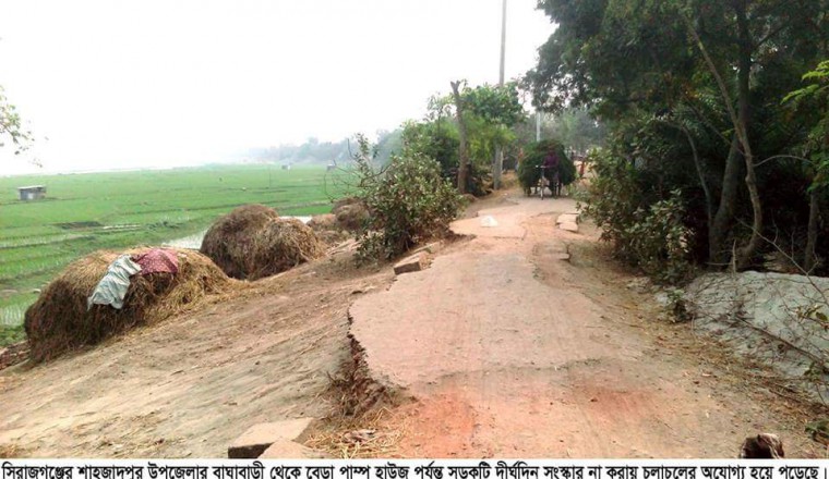 শামছুর রহমান শিশির : সিরাজগঞ্জ জেলার শাহজাদপুর উপজেলার রূপবাটি ইউনিয়নের বাঘাবাড়ী দক্ষিণ পাড় থেকে শুরু করে বেড়া পাম্প হাউজ পর্যন্ত মাত্র ৪ কিলোমিটার ‘মুজিব বাধ’ সড়কটি চলাচলের অনুপোযোগী হয়ে পড়েছে। ফলে জনগুরুত্বপূর্ণ এ সড়ক দিয়ে নিয়মিত প্রায় অর্ধলক্ষাধিক লোকের চলাচলে ও মালামাল পরিবহনে সীমাহীন দুর্ভোগ-দুর্গতি পোহাতে হচ্ছে। জনসাধারনের এ জনদুর্ভোগ লাঘবের কেউ নেই। ফলে শাহজাদপুর উপজেলার গালা ও রূপবাটি ইউনিয়ন এবং বেড়া উপজেলার বেশ কিছু গ্রামের প্রায় অর্ধলক্ষাধিক লোকের দুর্ভোগ-দুর্গতি ক্রমশ বৃদ্ধি পাচ্ছে। এছাড়া এ সড়কটির কিছুদুর পরপরই প্রস্থ এতটাই সংকীর্ণ ও সরু যেখান দিয়ে একটি রিক্সা বা ভ্যান চলাচলই দূরহ হয়ে পড়েছে। ফলে ওই ঝূঁকিপূর্ণ সরু সড়ক দিয়ে মালামাল পরিবহনে দশ মিনিটের পথ পাড়ি দিতে ঘন্টার ওপরে সময় লাগছে। জনগুরুত্বপূর্ণ খানাখন্দে ভরা ওই সড়ক দিয়ে বাঘাবাড়ী, রামখাড়ুয়া, চয়রা, বেড়া, মোয়াকোলা, আহম্মদপুর (ডোমবাড়িয়া), করশালিকা, আন্ধারমানিক,ভূল বাকুটিয়া, কুলিয়ারচর, ধুনাইল, বাগধুনাইল এলাকাসহ আশেপাশের বিশাল জনগোষ্ঠি নিয়মিত চলাচল ও কৃষিপন্যসহ সকল ধরনের মালামাল পরিবহনে অবর্ণনীয় দুর্ভোগ পোহাচ্ছেন। অথচ মাত্র ৪ কিলোমিটারের অতি স্বল্প দৈর্ঘ্যরে ওই মুজিব বাধ নামক সড়কটি পাঁকা করা হলে একদিকে যেমন এলাকাবাসীর দুর্ভোগ-দুর্গতি কমবে,অন্যদিকে তাদের সময় ও অর্থেরও সাশ্রয় হবার পাশাপাশি কৃষিসমৃদ্ধ এলাকা যোগাযোগ ব্যবস্থায় নবদিগন্তের সূচনা হবে। সরেজমিন ওই সড়ক পরিদর্শনকালে এলাকাবাসী জানায়, বাঘাবাড়ী দক্ষিণ পাড় থেকে বেড়া পাম্প হাউজ পর্যন্ত মাত্র ৪ কিলোমিটার দৈর্ঘ্যের মুজিব বাধটি প্রায় তিন দশক পূর্বে নির্মান করা হয়েছিল। এ সড়কটি নির্মান করে বেড়া ও সাঁথিয়া উপজেলাকে বন্যার আওতামূক্ত করা হয়। ফলে এ বাধটি নির্মাানের পর থেকেই বেড়া ও সাঁথিয়া উপজেলায় এক ফসলের পরিবর্তে বর্তমানে বহু ধরনের ফসল ও সবজির আবাদ করা হচ্ছে। ফলে এ এলাকার কৃষিখাতে অভূতপূর্ব সাফল্য অর্জন করতে সক্ষম হয়েছে কৃষকেরা। অত্যন্ত জনগুরুত্বপূর্ণ ওই বাধটি দীর্ঘদিন কোনরূপ সংস্কার ও মেরামত না করায় মাত্র ৪ কিলোমিটার দৈর্ঘের ওই সড়কের বিভিন্ন অংশে বিগত বন্যাগুলোর সময় প্রবল পানির তোড়ে মারাত্বকভাবে ক্ষতিগ্রস্থ হয়েছে। এছাড়া দীর্ঘদিন কোনরূপ সংস্কার বা মেরামতকাজ না করায় এ সড়কটির বিভিন্ন অংশে পিচ পাথর উঠে গিয়ে অসংখ্য খানা খন্দের সৃষ্টি হয়েছে। বন্যার সময় এ সড়কটি ভেঙ্গে পড়লে বেড়া ও সাঁথিয়া উপজেলার কৃষিখাতে অবর্ণনীয় ক্ষতি সাধিত হতে পারে। বাঘাবাড়ী পূর্বপাড় মহল্লার অসংখ্য এলাকাবাসী জানান, ‘পাউবো বলে রাস্তটি এলজিআরডির পক্ষ থেকে সর্